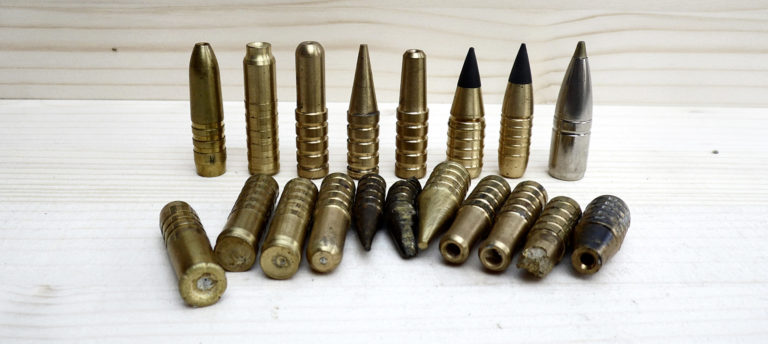 Useimmat messinkiluodit eivät juurikaan laajene. Ne joko muotoutuvat vain vähän tai sirpaloituvat. Etualalla lajitelma koeammuttuja, takarivissä vasemmalta Tarvas, Woodleigh Hydro, kolme eri Impala-versiota, 7,62 ja 9,3 mm Möller MJG. Oikeassa takareunassa on RWS:n tinaluoti.